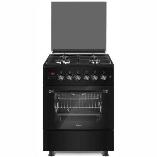 4 Burner + Wok Eheated Fan Electric Oven FFD Integrated Ignition Turnspit Lamo Digital Timer Cast Iron Glass Lid Matt Black